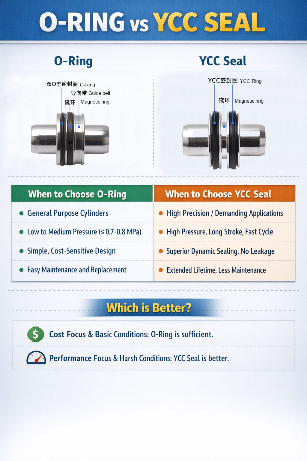 Dibandingkan dengan cincin-O tradisional, segel YCC memberikan penyegelan dinamis dan ketahanan aus yang lebih baik, memungkinkan silinder mempertahankan kinerja yang andal di bawah perubahan tekanan dan siklus berulang. Hal ini secara signifikan mengurangi kebocoran awal dan memperpanjang interval perawatan.